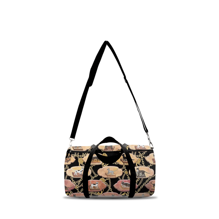 Travel with class or go to the gym in style, with this exclusive duffle bag featuring lucky cats! They come from an ancient Thai manuscript, The Tamra Maeo, that contains the cat breeds considered to be auspicious; it is also known as Cat-Book Poems because it contains a poem for every cat, like this one dedicated to a black cat with white paws: "All four paws white, two green eyes, The name Beauty for its body’s black field."