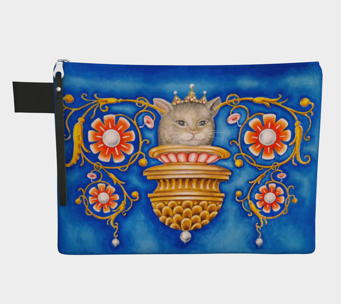 This pouch features not just any cat, but the King of Cats himself! In this beloved medieval story, cats have secret identities and nothing is as it seems. In this design, the King of Cats wears a golden coronet full of precious pearls, sign of his newfound royalty. He sits inside a jewel, while majolica vines sprout out of his ears, interesting details we explain in our blog article. Click here to read the whole story about the King of Cats.