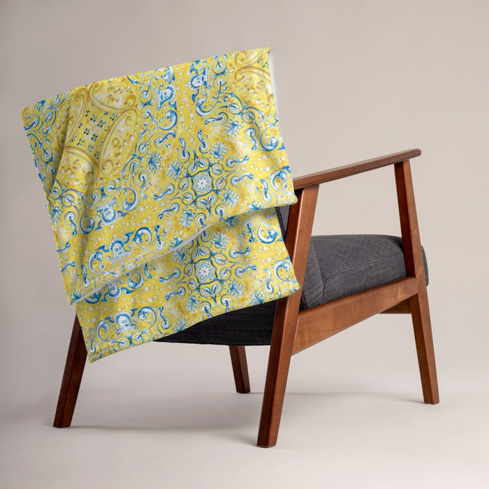 In this design, gargoyles intertwine with pearl strings and floral elements, creating a complex and refined pattern. The cobalt blue elements sit on a golden background, making this blanket well adaptable to any color scheme you already have in your home. Check the Related Products below to get the matching "Angels & Gargoyles" throw pillow.