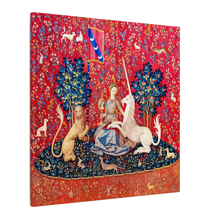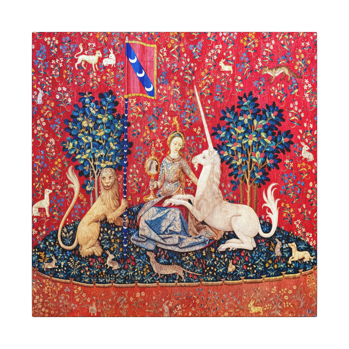 This stretched matte canvas will bring a piece of medieval wonder directly into your home! Considered one of the most beautiful scenes in the Lady and Unicorn series, our fully restored version features rich, jewel-toned reds and deep blues that will revive any corner. The 0.75" depth makes it perfect to place above a mantel, beside a reading chair, or on a hallway. It hangs steady thanks to soft rubber pads on the back, and the certified inks keep colors vivid while staying eco-conscious.
