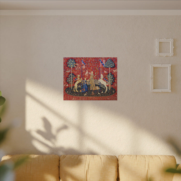 With this museum-grade stretched matte canvas, you can finally bring home one of the most iconic medieval artworks, fully restored and ready to hang! Part of The Lady and the Unicorn series, this artwork features jewel tones with rich reds and deep blues, thanks to the unique color restoration process....