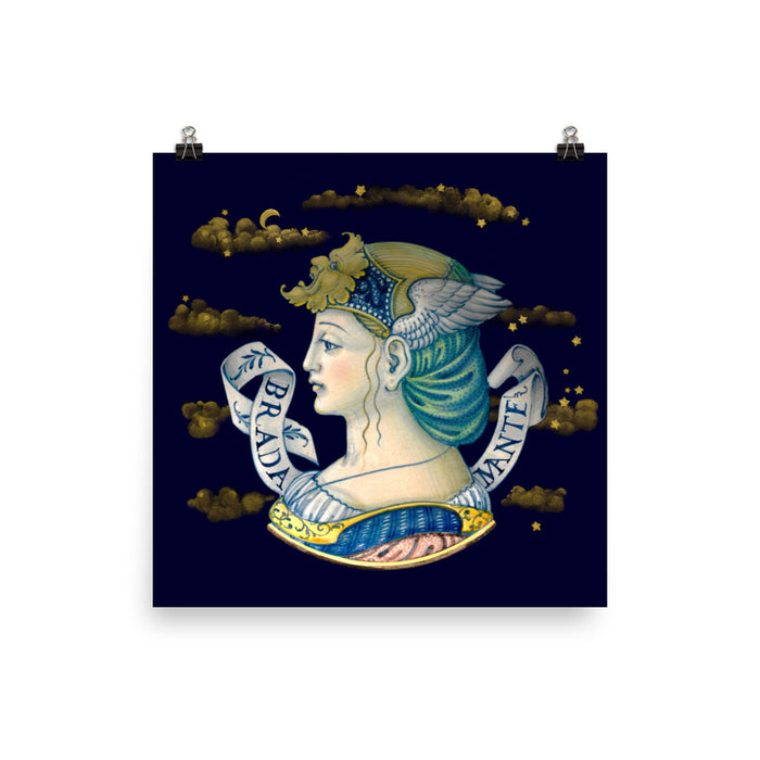 Bring a piece of exciting history to your home with this unframed poster portraying female knight Bradamante, the first female heroine of the Western culture, celebrated in the epic poem Orlando Furioso by Ludovico Ariosto.
