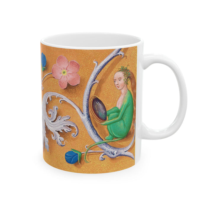 The design comes from an authentic medieval manuscript belonging to Queen Isabella of Spain. Among the flowers, a figure sits in the corner while looking into a mirror. She is not just a pretty maid with a floral crown, but she hides a secret as her little tail reveals. She is Melusine, the serpent-woman, and her story has become legend throughout Europe.