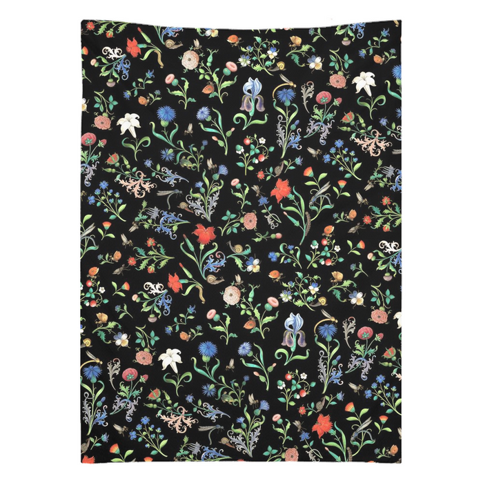 This elegant tapestry features botanical art based on authentic medieval manuscripts. Here wild berries and flowers are the perfect playground for busy butterflies, small snails, and curious dragonflies, that frolic among the spiraling leaves typical of scroll art. The colorful flowers are set against a modern black that suits any environment. This is an exclusive MedievalMade creation that took great effort, since we had to go through hundreds of illuminations and isolate the best elements, digitally restore them, and finally create an interlocking repeating pattern. The result really reflects our mission of a modern design inspired by history!